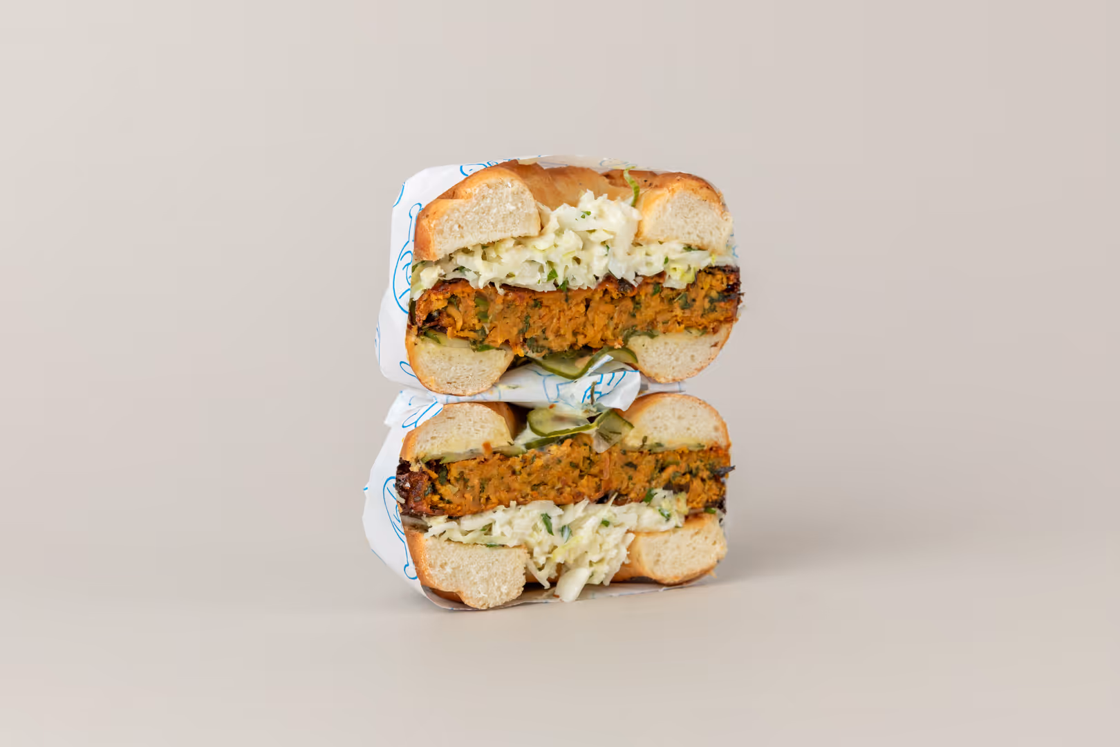 Katsu sweet potato fritter, fresh herbs & cabbage slaw, Hank’s pickles, katsu aioli (v)